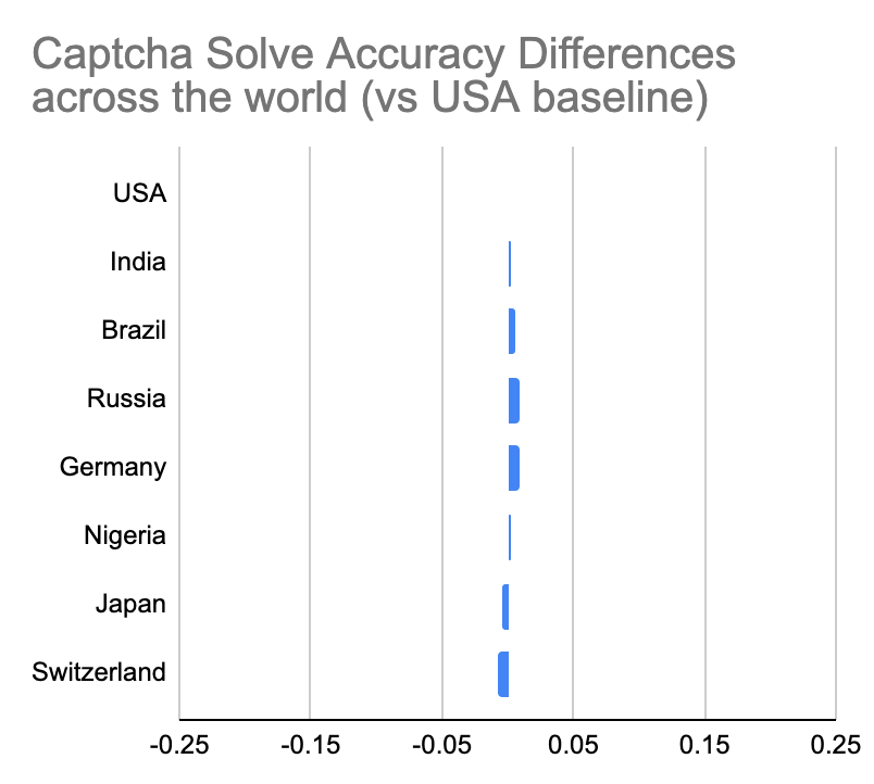 However, our data shows that (for hCaptcha) there is less than 1% variance in solve rates across major countries on every continent. Many countries in fact do slightly better than the US, including Nigeria, India, Brazil and Germany: