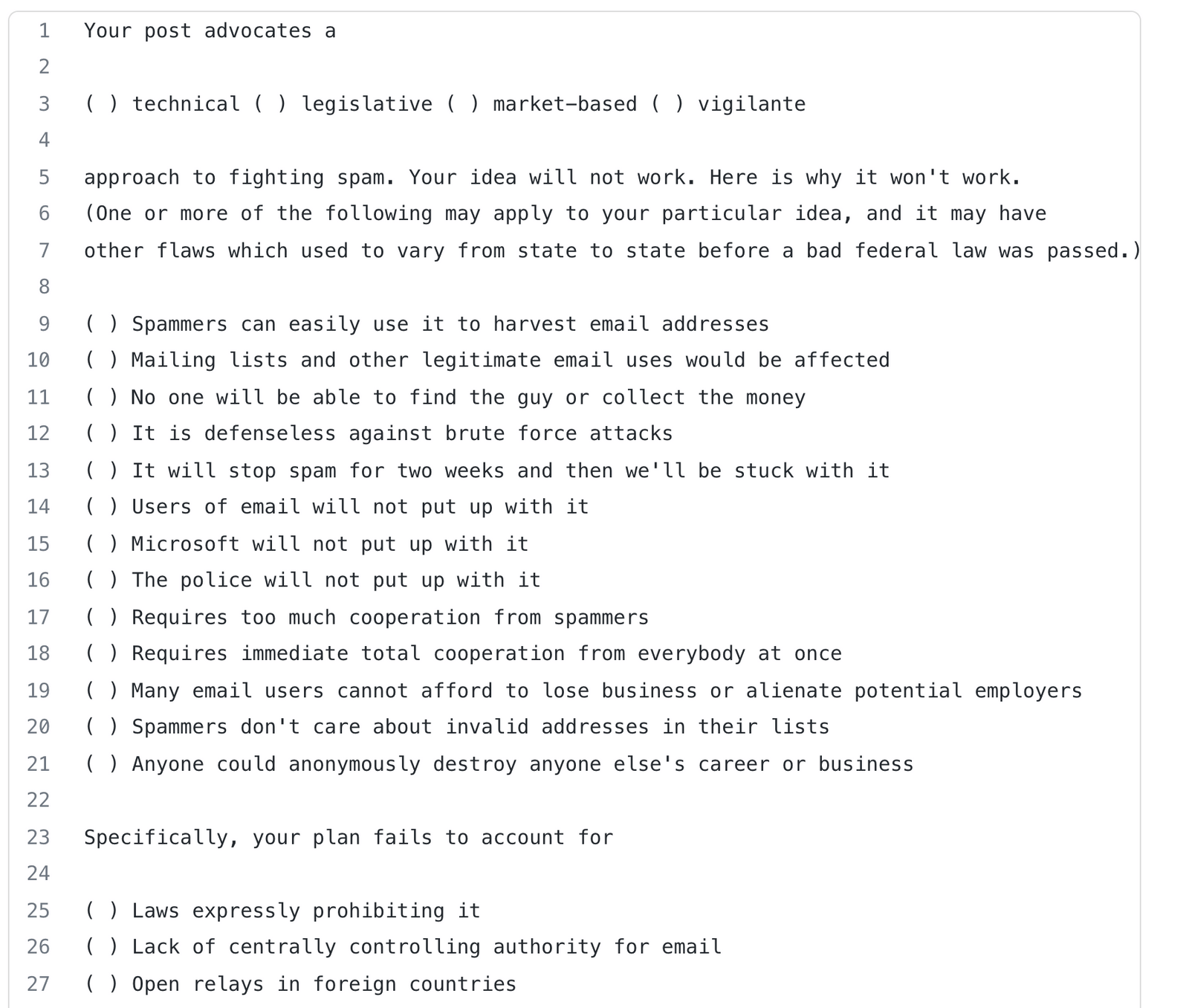 Why your new anti-spam solution won’t work. Unknown author, c. 2000